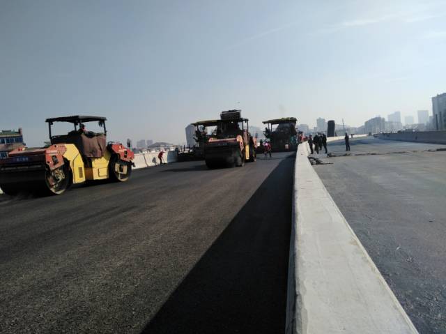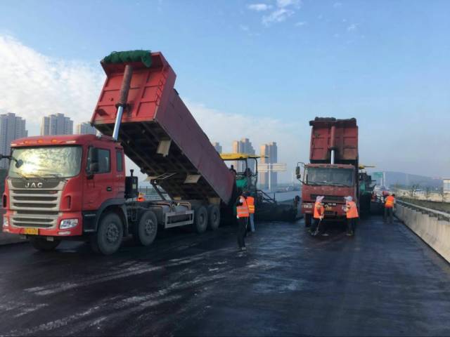 11月6日,清晨6点18分,我司实施项目丁卯桥快速化改造工程桥面沥青摊铺工程正式开始。