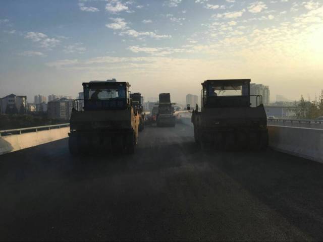 据了解,本次沥青摊铺桥面地点位于镇江市五凤口高架和丁卯高架连接处,现场两台摊铺机同时施工,三台钢轮压路机和两台胶轮压路机前后交错进行沥青面层碾压。本次摊铺为沥青试验段摊铺,包括五凤口高架2联和丁卯高架3联,共5联,摊铺路段长450米,摊铺沥青约1200余立方米,分层摊铺。