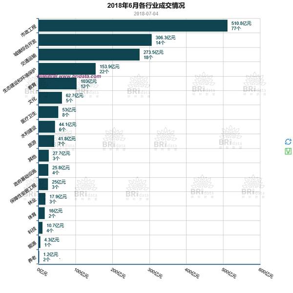 本月市政工程行业以510.8亿元的成交金额占据了行业成交榜的首位,城镇综合开发和交通运输行业也贡献了较大的成交份额。具体如下图所示: