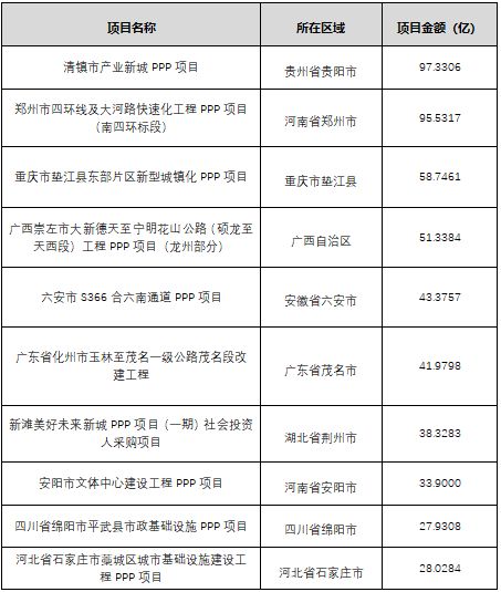 本月中标规模最大的项目为清镇市产业新城PPP项目,项目规模达到了97.33亿。本月成交规模排名前十的项目分别为: