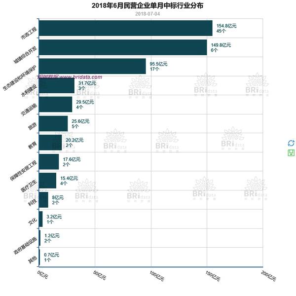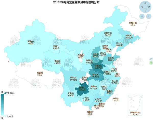 本月民营企业作为单独投标方或联合体牵头方共中标95个项目,合计556.50亿元,本月民企中标项目个数与上月持平。中标区域、行业分布如下图所示: