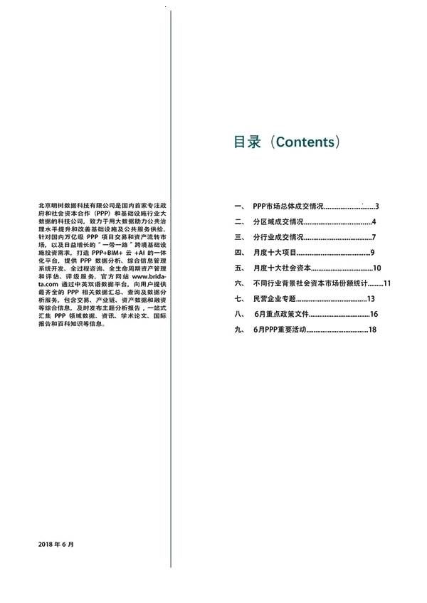 北京明树数据科技有限公司独家每月向市场发布全国PPP市场的最新动态,数据包括项目成交金额、分区域项目成交状况、分行业项目成交状况、当月十大项目和十大社会资本,以及民营企业参与PPP的数据专栏,并提供最新PPP相关政策文件介绍和PPP重要活动介绍。