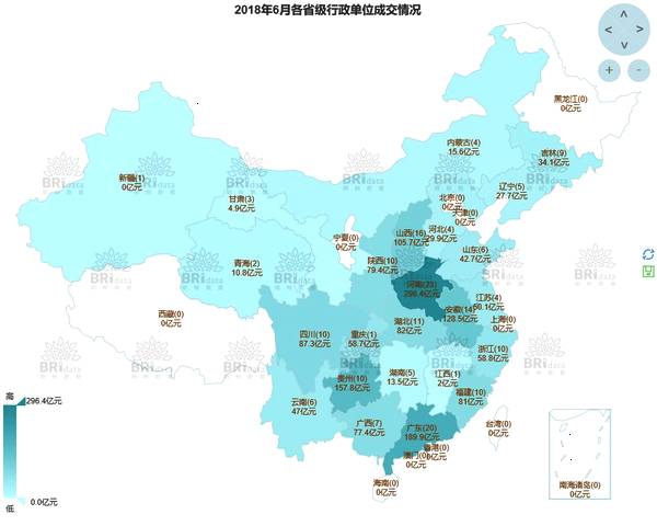 从区域成交的情况来看,本月河南省、广东省和贵州省成交的项目金额排名前列,分别成交了365.0亿元、393.1亿元、169.1亿元。截止至2018年7月底,贵州省落地项目总规模超过了新疆地区,云南省、河南省和贵州省占据了累计实施PPP项目金额的前三位。具体如下图所示: