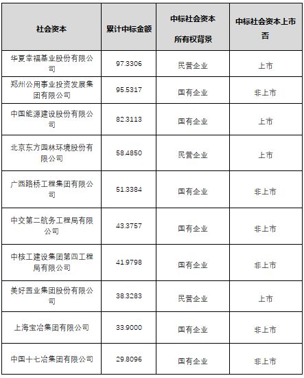 我们将社会资本按照行业背景和所有制背景进行了分类,不同社会资本中标金额和中标个数数据分别如下:
