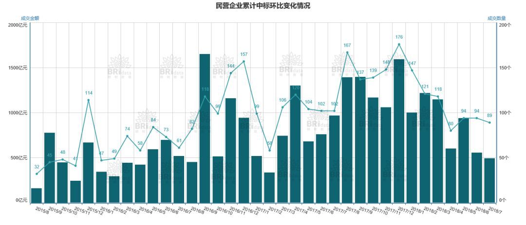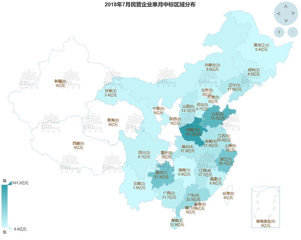 本月民营企业作为单独投标方或联合体牵头方共中标89个项目,合计491.45亿元,本月民企中标项目个数与上月持平。中标区域、行业分布如下图所示:
