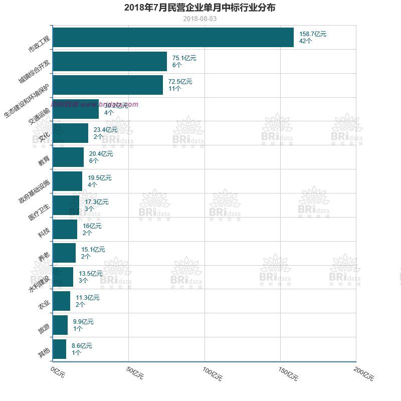 本月市政工程行业以617.5亿元的成交金额占据了行业成交榜的首位,生态环境保护和城镇综合开发行业也贡献了较大的成交份额。具体如下图所示: