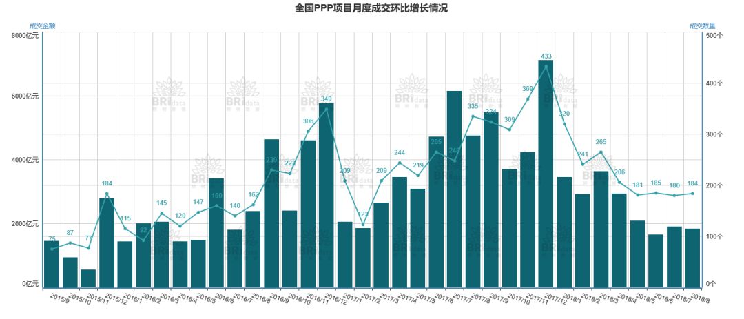 本月全国共成交了184个PPP项目,共计1837.14亿元,截止至2018年8月底,全国范围内公布中标的PPP项目已达到11.66万亿元,总个数为8048个。8月PPP落地项目个数较上月略微有所增加,但项目规模有所下降,具体如下图所示: