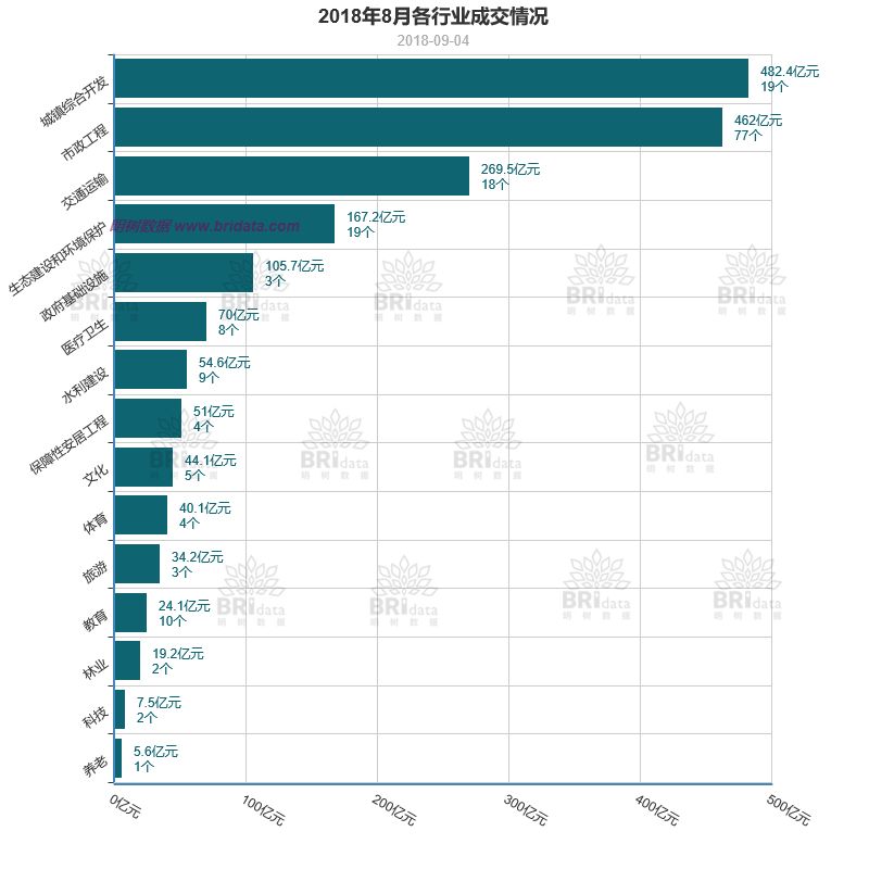 本月城镇综合开发行业以482.4亿元的成交金额占据了行业成交榜的首位,市政工程和交通运输行业也贡献了较大的成交份额。具体如下图所示: