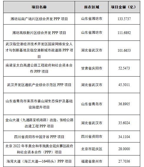 本月中标规模最大的项目为潍坊站南广场片区综合开发PPP项目,项目规模达到了133.57亿。本月成交规模排名前十的项目分别为: