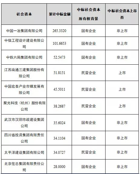 本月中国一冶集团有限公司以累计265.33亿元的中标金额在市场力压群雄。排名前10的社会资本分别为(以下仅统计社会资本作为牵头人或者单独中标的业绩):