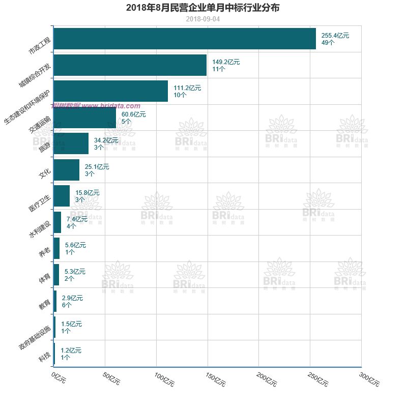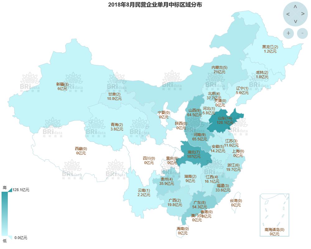 本月民营企业作为单独投标方或联合体牵头方共中标99个项目,合计675.30亿元,本月民企中标项目个数及项目规模均较上月有所增加。其中民营企业中标区域、行业分布如下图所示: