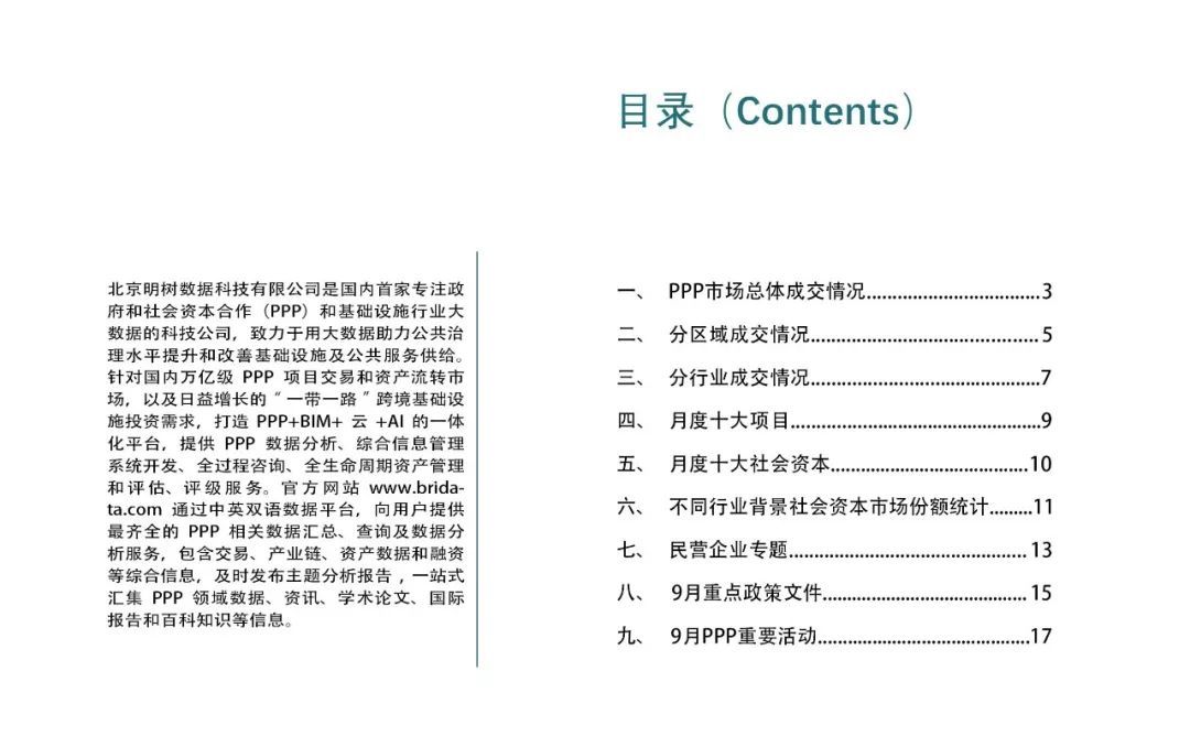 北京明树数据科技有限公司独家每月向市场发布全国PPP市场的最新动态,数据包括项目成交金额、分区域项目成交状况、分行业项目成交状况、当月十大项目和十大社会资本,以及民营企业参与PPP的数据专栏,并提供最新PPP相关政策文件介绍和PPP重要活动介绍。