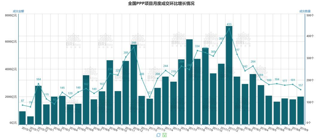 本月全国共成交了157个PPP项目,共计1993.24亿元,截止至2018年9月底,全国范围内公布中标的PPP项目已达到11.85万亿元,总个数为8191个。9月PPP落地项目规模较上月略微有所增加,但项目个数有所下降,具体如下图所示: