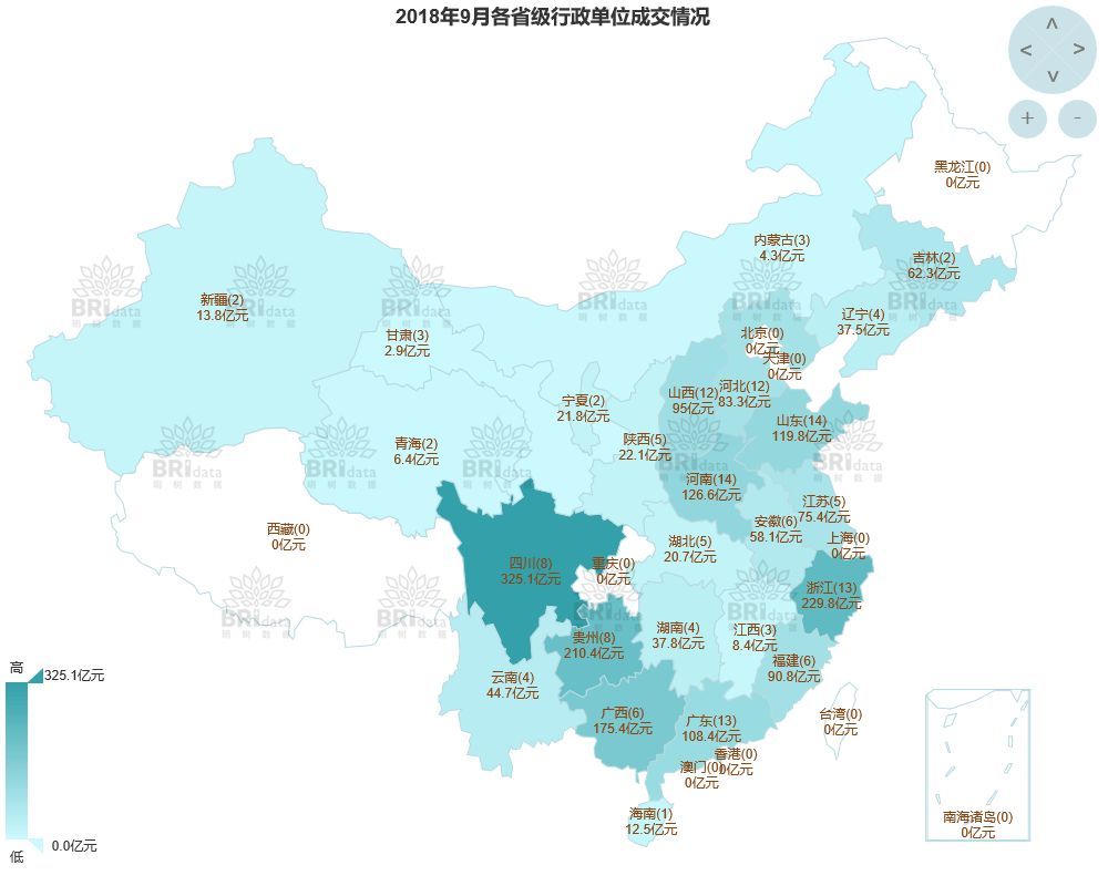 从区域成交的情况来看,本月四川省、浙江省和贵州省成交的项目金额排名前列,分别成交了325.1亿元、229.8亿元、210.4亿元。截止至2018年9月底,河南省落地项目总规模超过了云南省位列第一,河南省、云南省和四川省占据了累计实施PPP项目金额的前三位。具体如下图所示: