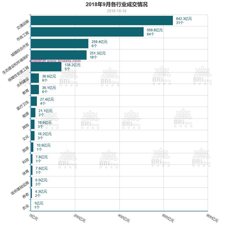 本月交通运输行业以642.3亿元的成交金额占据了行业成交榜的首位,市政工程和城镇综合开发行业也贡献了较大的成交份额。具体如下图所示: