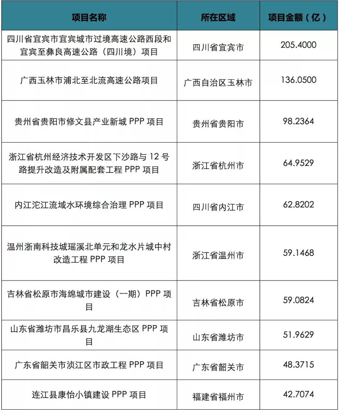 本月中标规模最大的项目为四川省宜宾市宜宾城市过境高速公路西段和宜宾至彝良高速公路(四川境)项目,项目规模达到了205.4亿。本月成交规模排名前十的项目分别为: