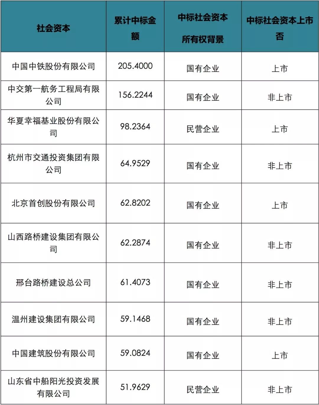 本月中国中铁股份有限公司以累计205.4亿元的中标金额在市场力压群雄。排名前10的社会资本分别为(以下仅统计社会资本作为牵头人或者单独中标的业绩):