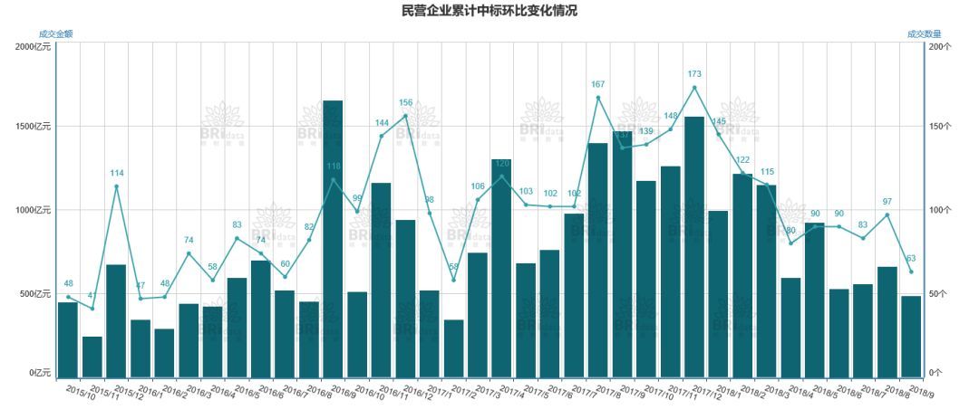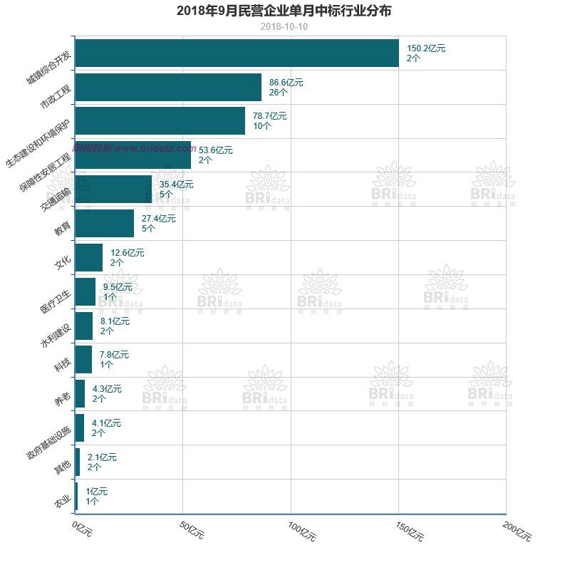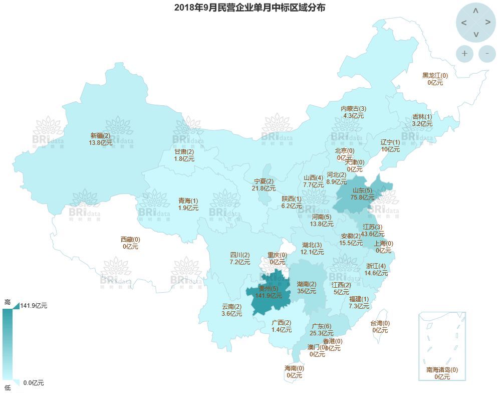 本月民营企业作为单独投标方或联合体牵头方共中标63个项目,合计481.41亿元,本月民企中标项目个数及项目规模均较上月有所下降。其中民营企业中标区域、行业分布如下图所示: