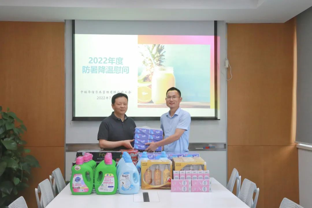 7月21日,中核华信资本工会组织开展2022年度防暑降温慰问活动。公司总裁陆俊华,工会主席、副总裁冯恂,总裁助理王睿代表公司工会向员工发放防暑降温用品,为奋斗在岗位上的广大员工送去一片夏日清凉。