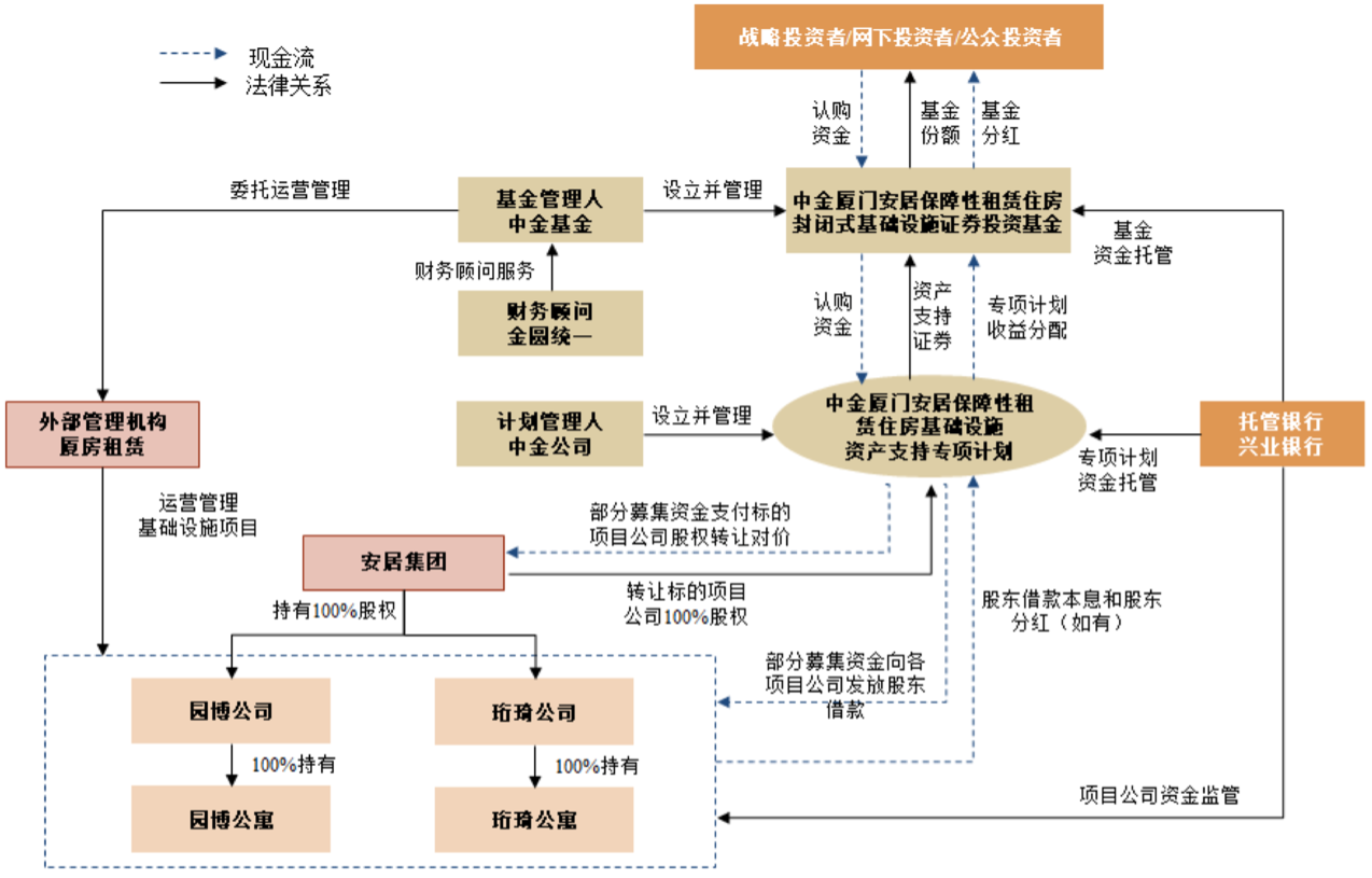 安居集团与园博公司、珩琦公司于2022年5月11日分别签署《借款协议》,由安居集团向园博公司、珩琦公司提供借款用于园博公司缴纳园博公寓项目土地出让金、珩琦公司缴纳珩琦公寓项目土地出让金。专项计划拟以基金的认购款项:(1)受让标的项目公司全部股权。(2)通过发放股东借款的形式完成对项目公司的债权投资,优先用于项目公司偿还应付原关联方债务,剩余部分(如有)用于补充生产、经营所需流动资金。